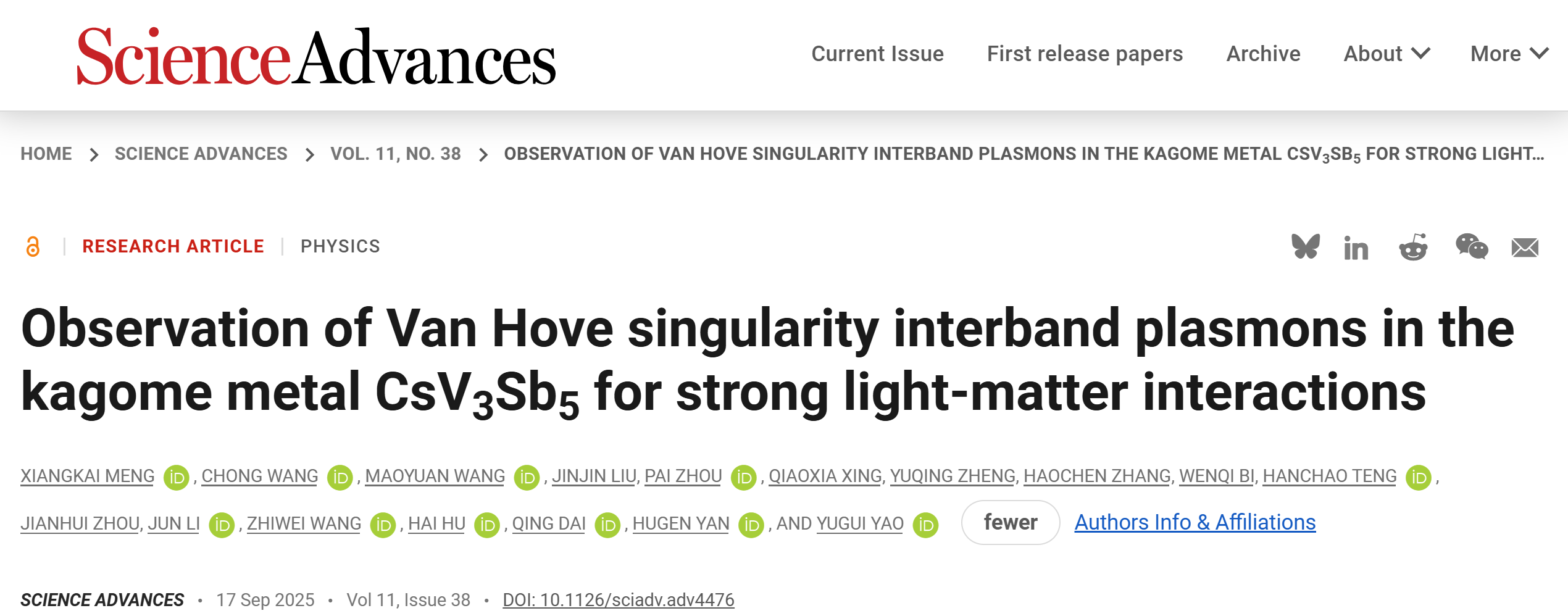 日前,必赢网址bwi437姚裕贵教授团队王冲副教授、王秩伟教授与复旦大学物理系的晏湖根教授团队、上海交通大学戴庆教授/国家纳米科学中心胡海研究员团队合作,通过低温显微红外光谱测量技术首次观测到了存在于笼目晶格材料CsV3Sb5薄膜中的范霍夫奇点带间跃迁等离激元(VHS interband plasmon)现象,实现了对等离激元与范霍夫奇点关联激发态间耦合的调控,为在关联电子体系材料中调控光与物质相互作用提供了新途径。相关研究题目为Observation of Van Hove singularity interband plasmons in the kagome metal CsV3Sb5 for strong light- matter interactions,成果被发表在期刊《Science Advances》上【Sci. Adv.11,eadv4476(2025)】。