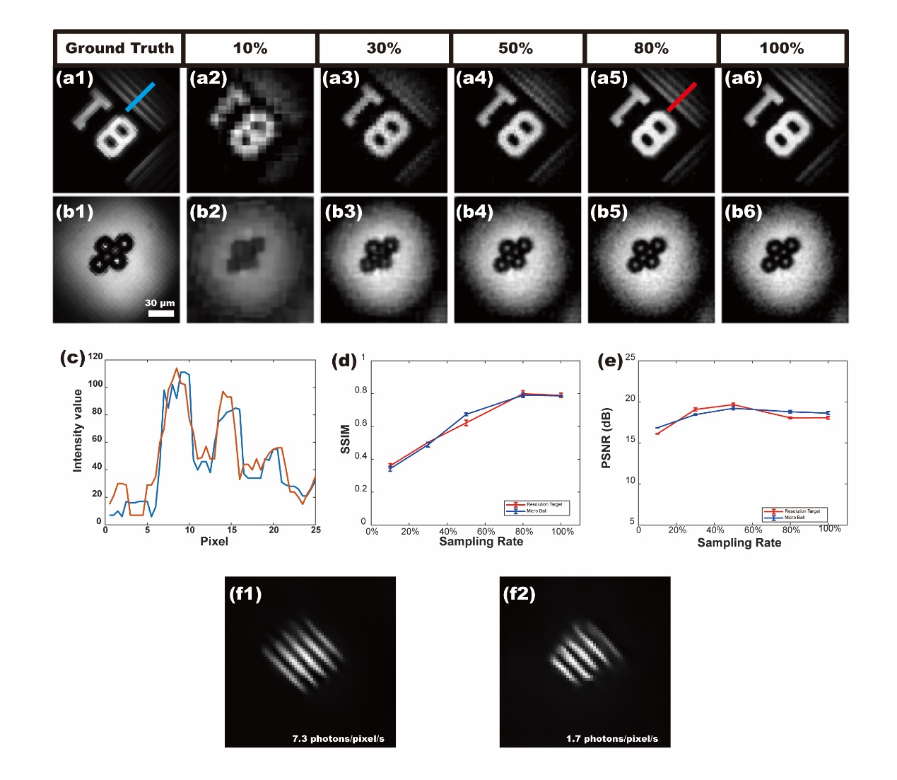 通过超构透镜高分辨率结构投影,以及单像素成像在低光条件下的鲁棒性,该系统成功重建最小尺寸为12微米的目标图像,其结构相似度(SSIM)为0.7993,峰值信噪比(PSNR)为18.05eB。尤为突出的是,该系统在极微弱光照(1.7光子/像素/秒)的单光子级别条件下,成功重建了17.5微米的目标图像。