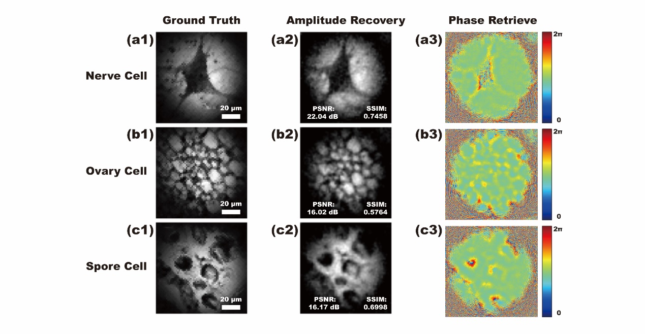 此外,该系统除了高质量重建生物样本的振幅图像外,还对相关样本的相位图像进行重建,使得该系统具有对复杂光场成像的功能。