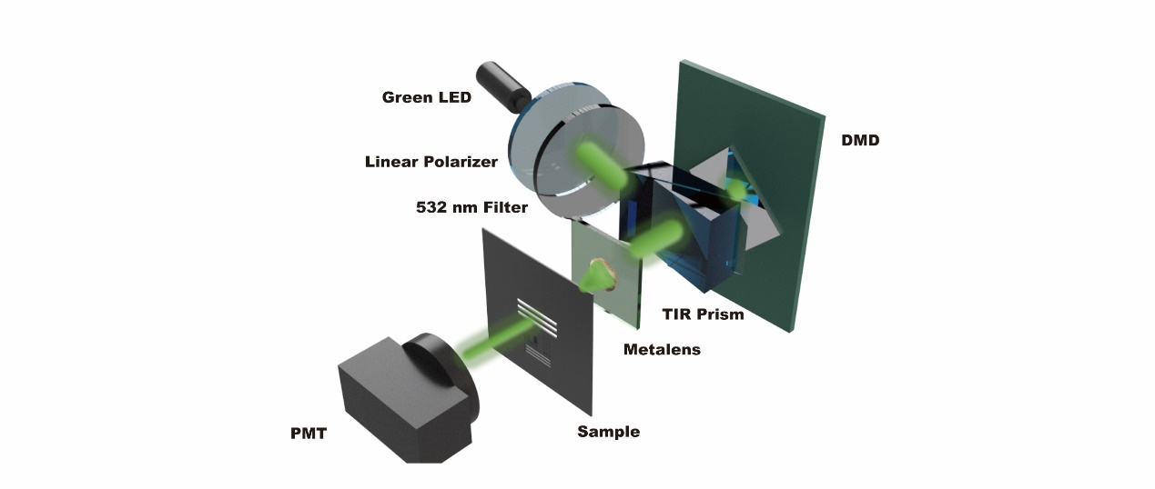 该研究提出并实现了一种基于超构透镜的紧凑型单像素显微成像系统,该系统将超构透镜和主动照明单像素成像进行高效集成。相比于传统的显微成像系统和其它单像素显微成像系统,该系统从DMD到PMT的距离尺寸大约为4厘米。